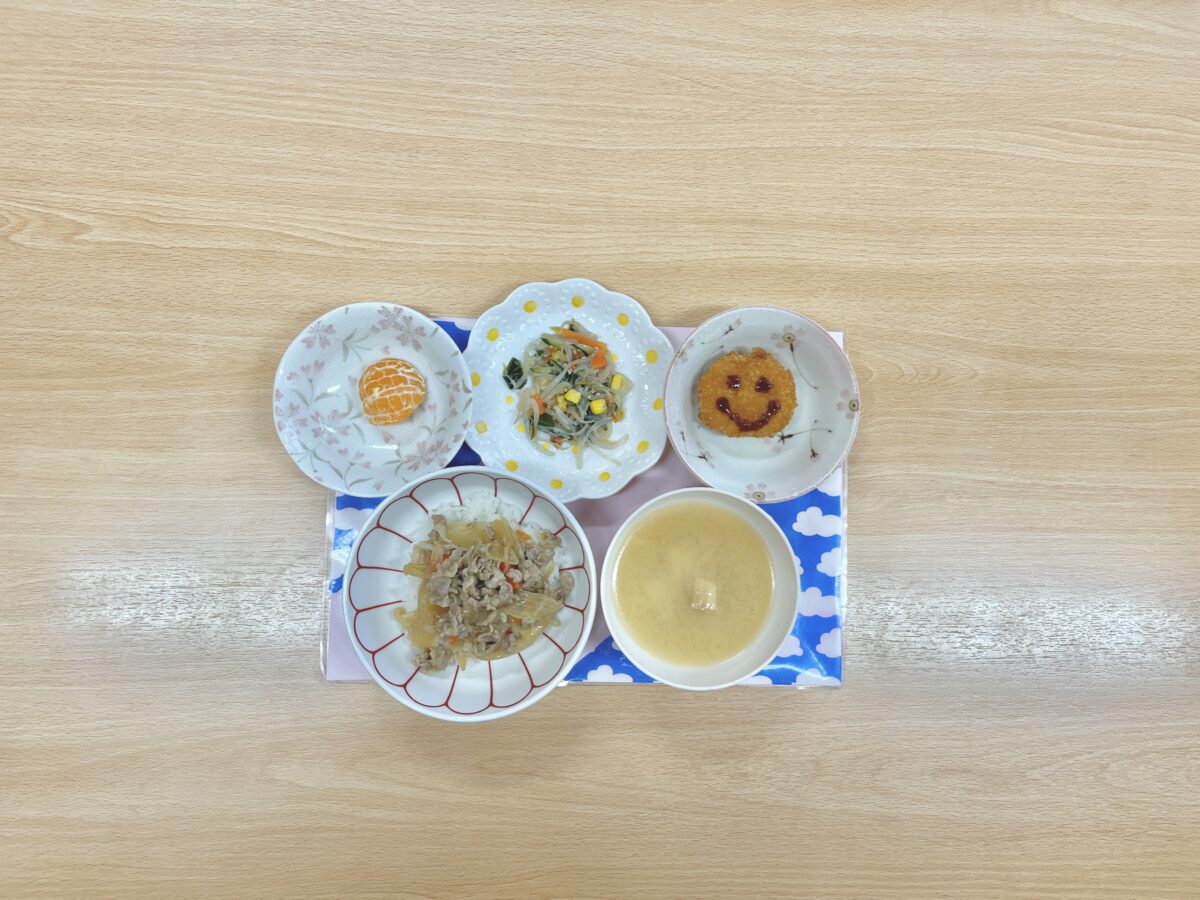 今日は肉丼でした☆お肉が柔らかく、ごはんが進む味付けとなっています♪旬のキャベツは甘く柔らかくて、子どもでも食べやすいです💕