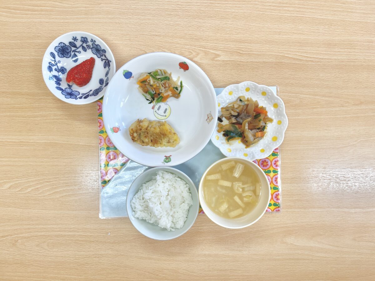 今日は、ほっけの磯辺揚げでした☆外はさくさく中はふんわり柔らかに揚がっています♪和風和えは、なめこのとろみでツルっと食べやすいです。