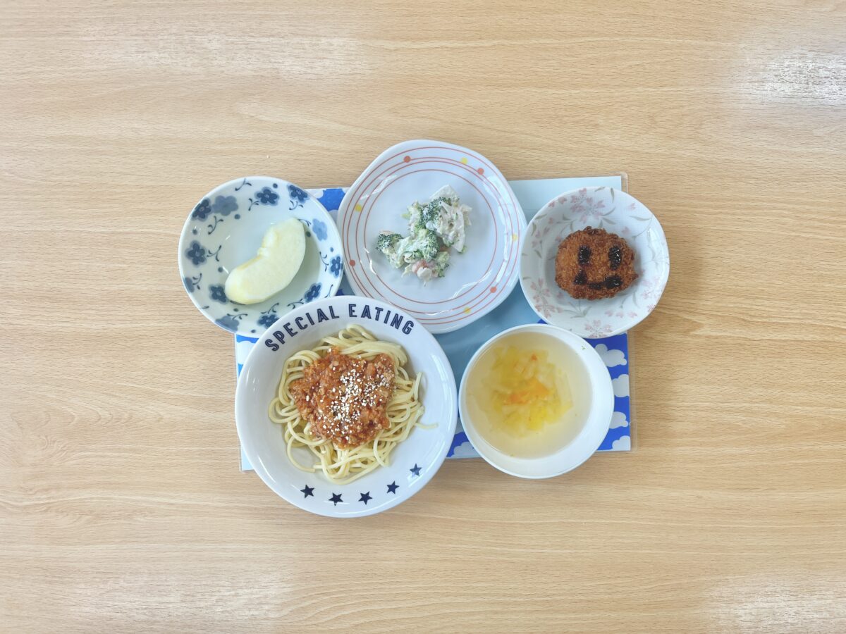 今日は大人気メニューのミートソーススパゲティでした💕サラダには蓮根が入っており、シャキシャキとした食感を楽しめます☆スープには旬の白菜をたっぷり使いました🎶