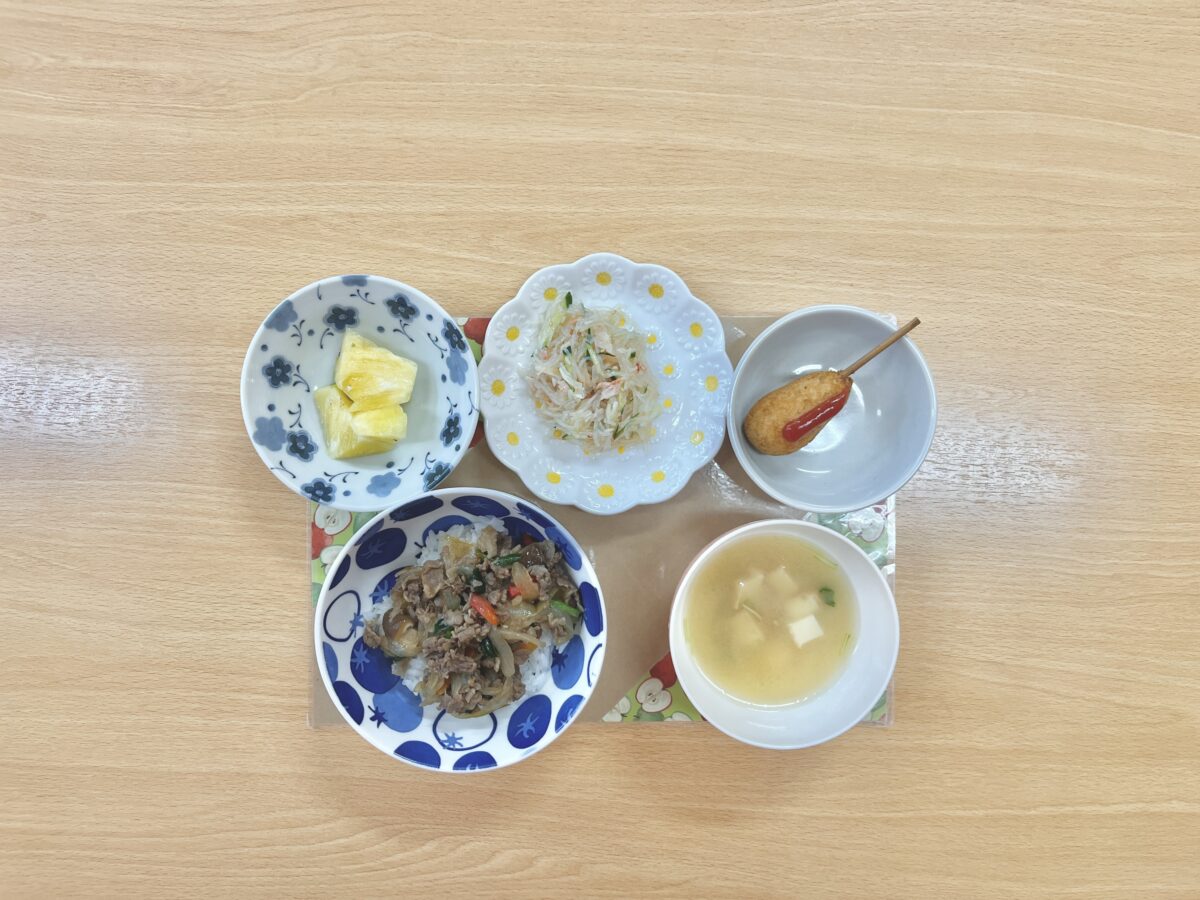 今日は、プルコギ風牛丼です☆赤パプリカとニラが入っておりスタミナの付く味付けになってます♡中華和えは、春雨がたっぷりと入っておりさっぱりと食べらます♪
