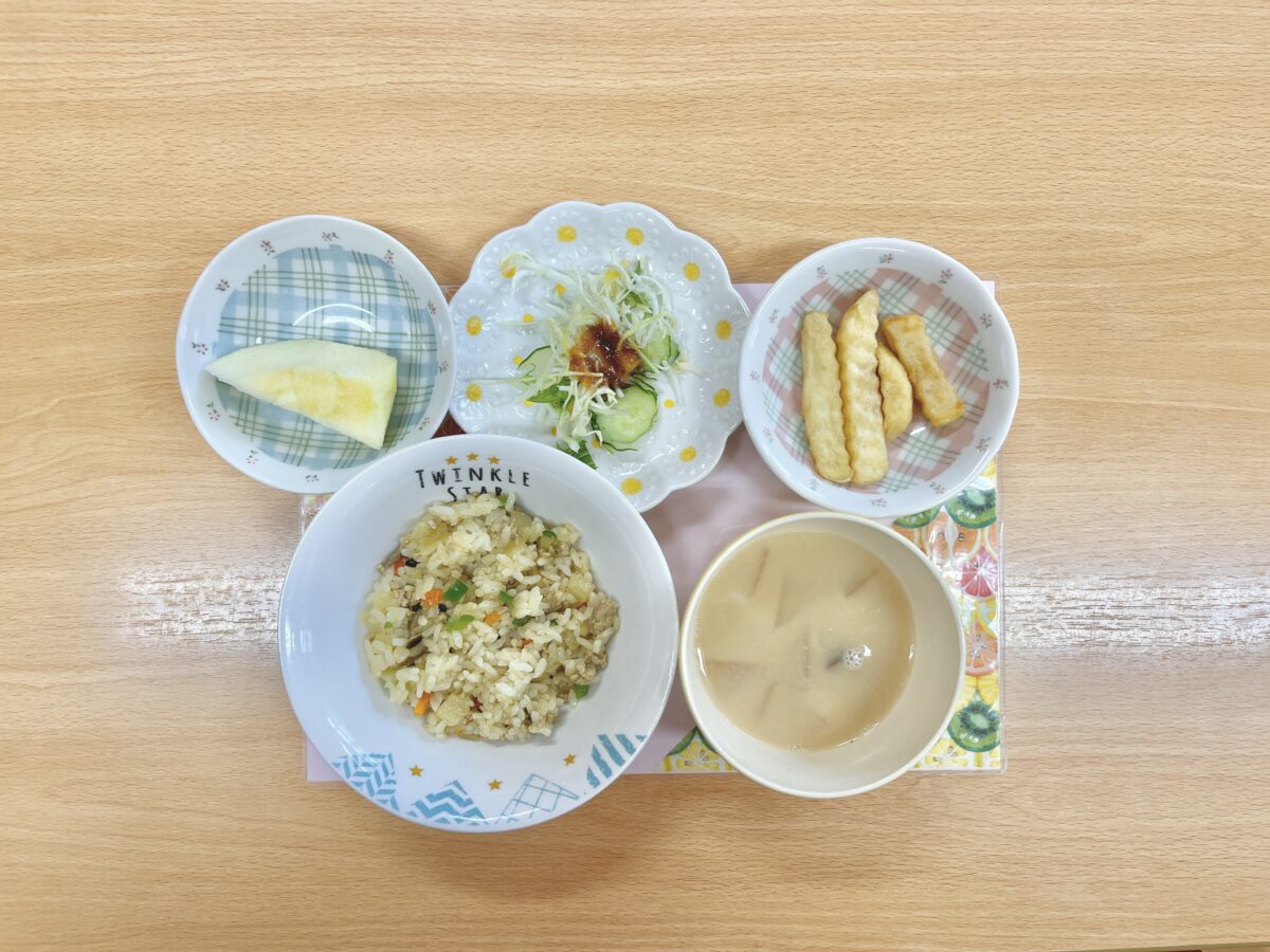 今日はドライカレー風ピラフでした☆カレー風味のピリッとしたピラフは、子ども達に大人気でした♬みそスープは牛乳を入れることで洋風にまろやかに仕上げました♡