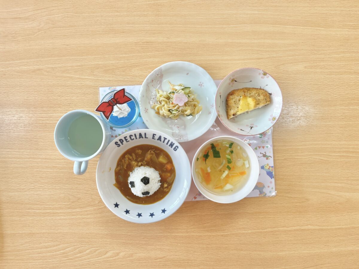 今日はお誕生会でした♪コナンがテーマで、サッカーボールがカレーにのっています⚽ゼリーには変声器の蝶ネクタイを飾り付けています♡