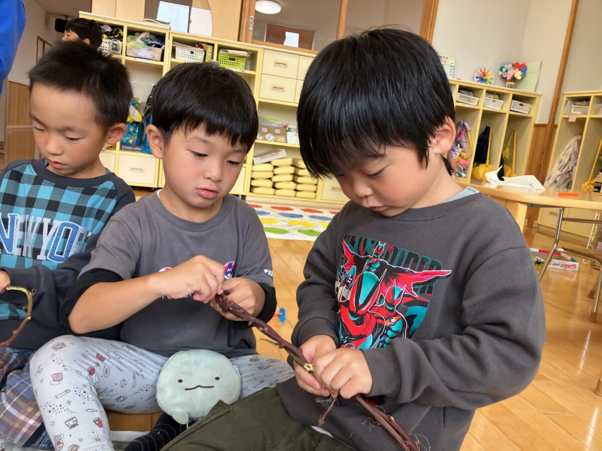さつまいも掘りをしてゲットしたつる!! それを使って、リース作りをしようと準備中です♫ つるとつるを組み合わせて丸くしようとしても、ぴょんっととび出し思うようになかなかまとまらないつる… 苦戦しながらも友達と方法を考え、 […]