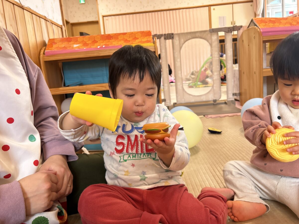 お友達や先生の真似っこ遊びが大好きなはと組のみんな☆ 手作りのバチを手に持って太鼓遊びをしているお友達を見て、「僕もやってみたいなー♬」と思いつき 真似をしてドンドン♬とリズムを取って楽しんでいましたよ☆ 先生の真似をし […]