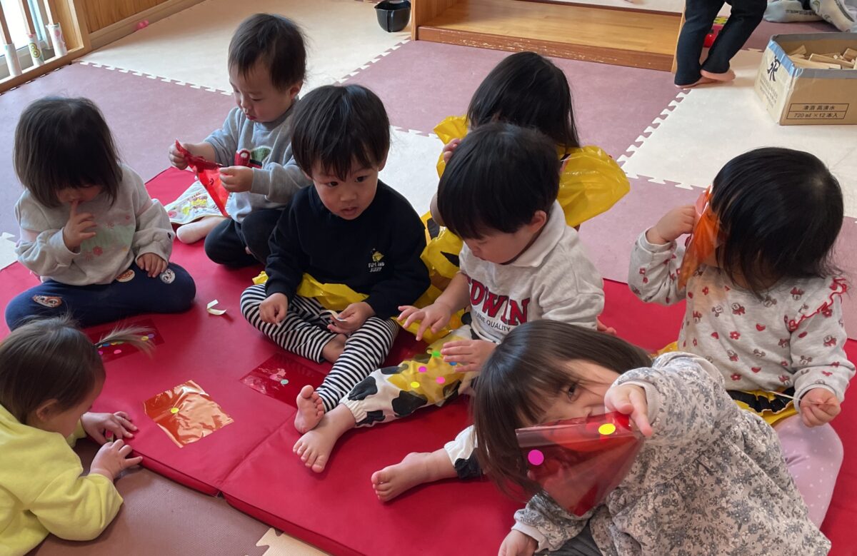 先日から楽しんでいるキャンディーづくりをして遊びました🎵 カラーセロファンや広告紙をキャンディーに見立てて、シールで飾りつけしたり、保育士と一緒にキャンディーを包んだりして楽しんでいた子どもたちです! お友 […]