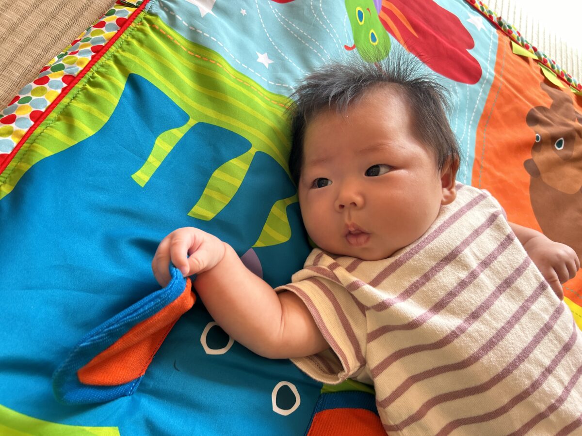 新しくお部屋に仲間入りしたプレイマットも大人気で、カシャカシャ音を楽しんだり上からぶら下がっているぬいぐるみをじーっと見たり・・・
