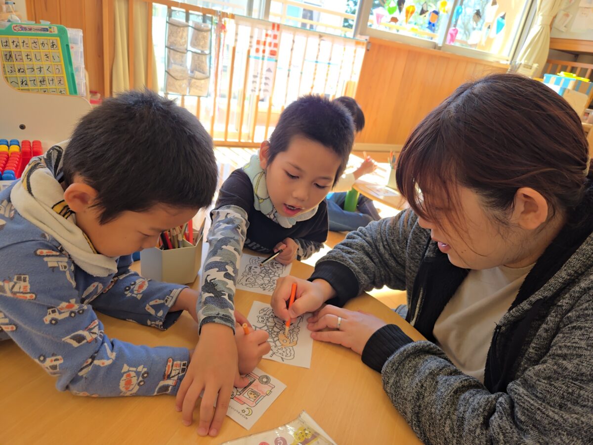 ママと一緒に遊ぶ時間は、お家で遊ぶよりも特別な時間♡ぬり絵もじっくり楽しみ、甘えていましたね♡