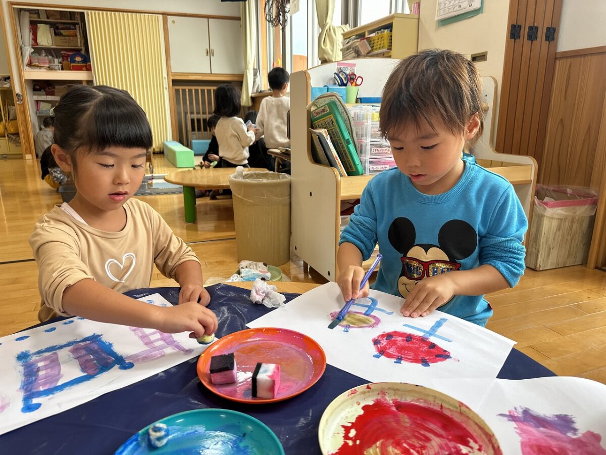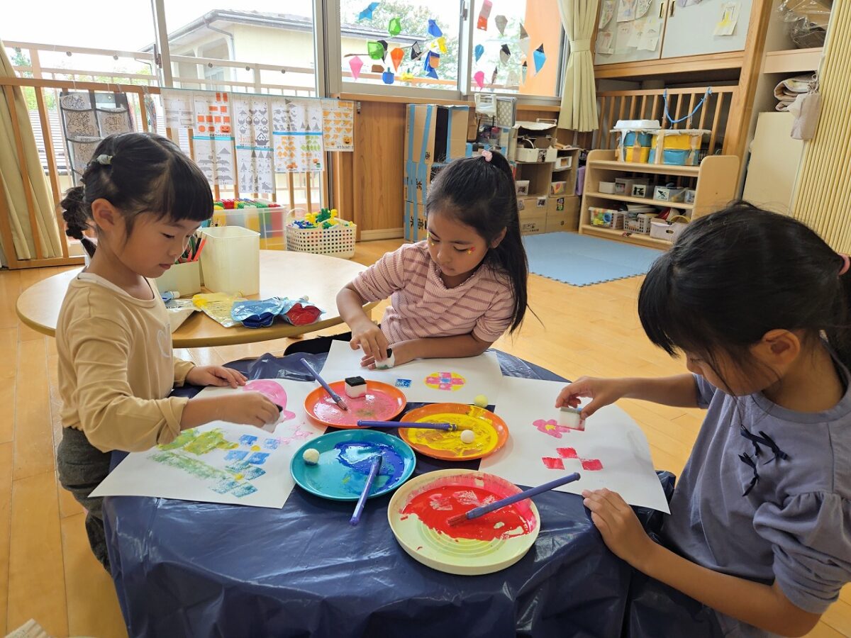 お部屋では、スポンジで何が出来るかな??とお絵描きスタート!!