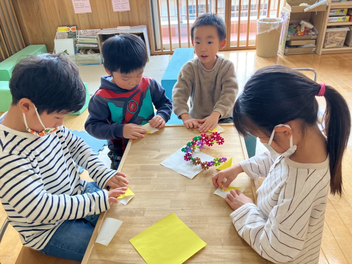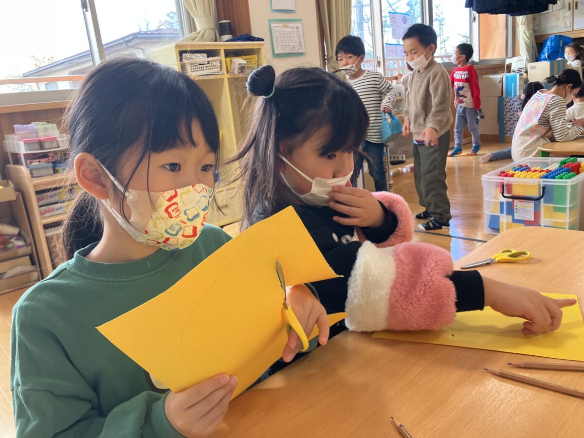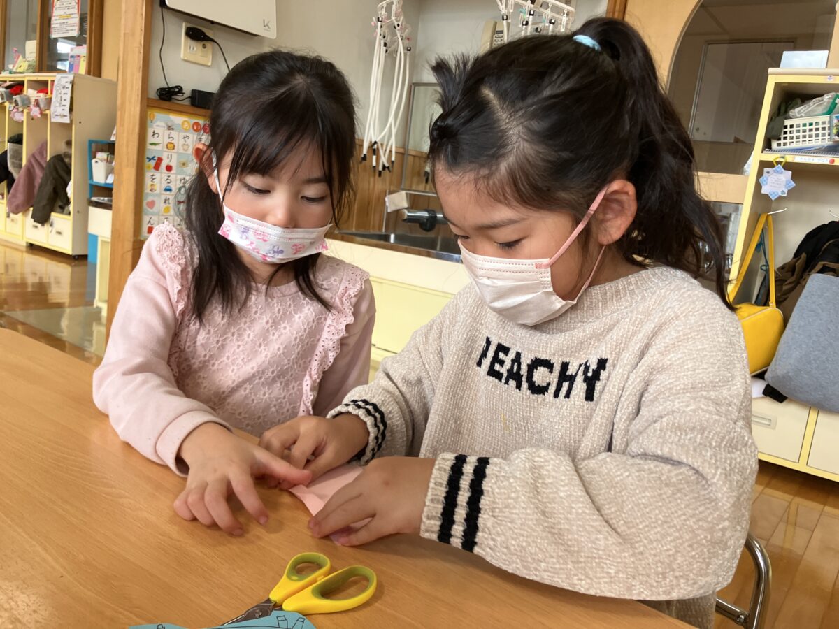 「しっぽは、作って貼った方がかわいいかも♡」「星は、描かないで折り紙で作るのはどう?」などといろいろなアイディアもうまれ、お互いの考えを取り入れたり、難しいところは教えてもらいながら協力して作ったり