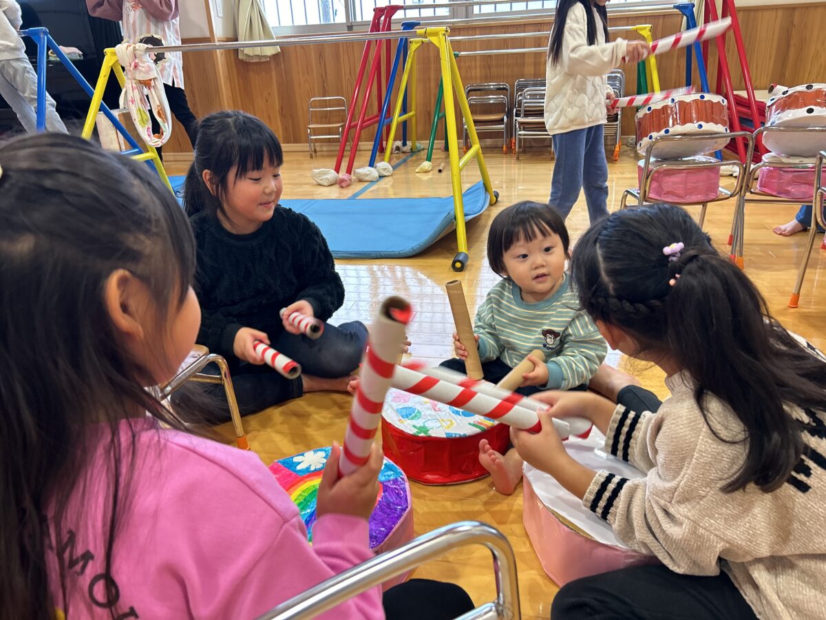 竿燈や太鼓の興味津々で、どっこいしょ~と応援してもらったり、太鼓の叩き方を教えてもらい、太鼓の音や叩くことを楽しみました💕