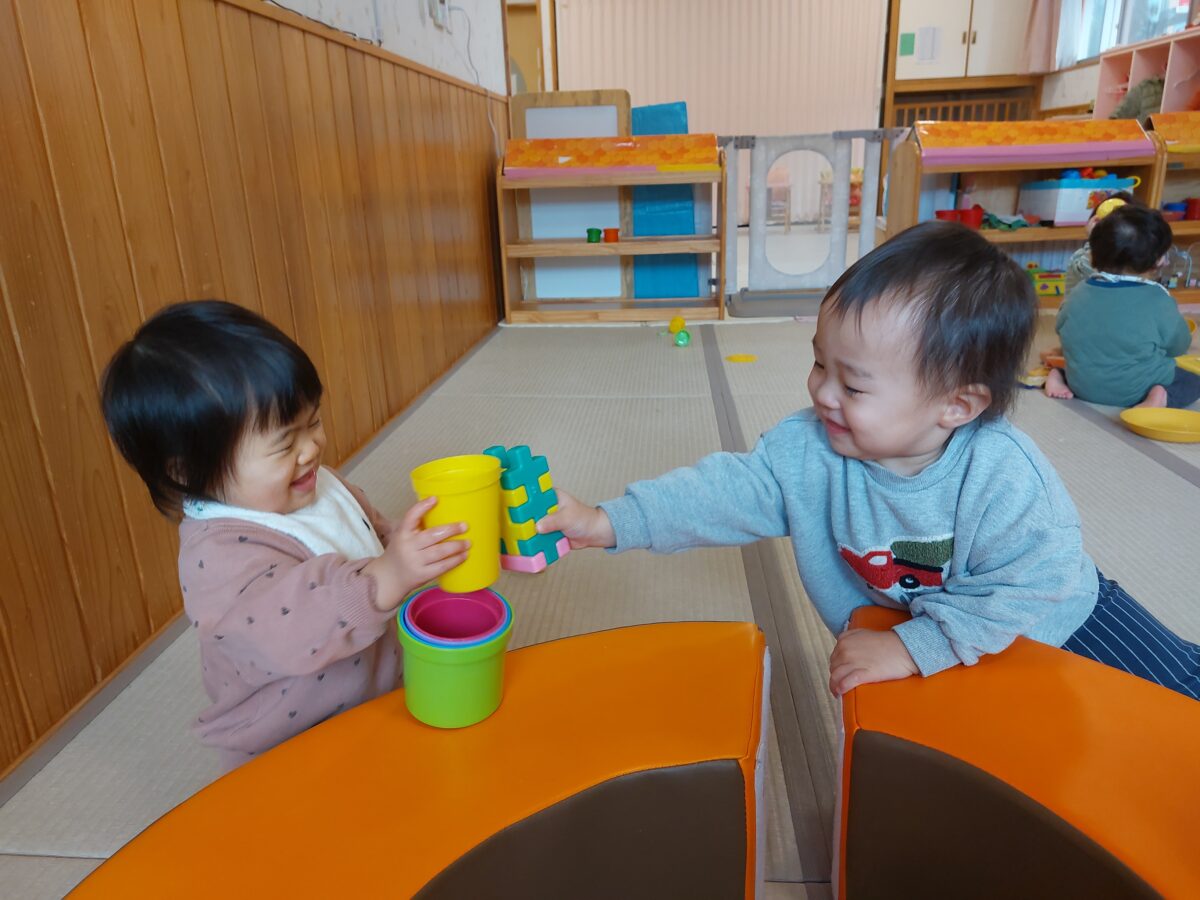 ブロックでジュースを作ると今までは自分でごくごくと飲んで楽しんでいましたが、最近は「かんぱーい♪」をしながら一緒に楽しもうとする気持ちが芽生えてきています。