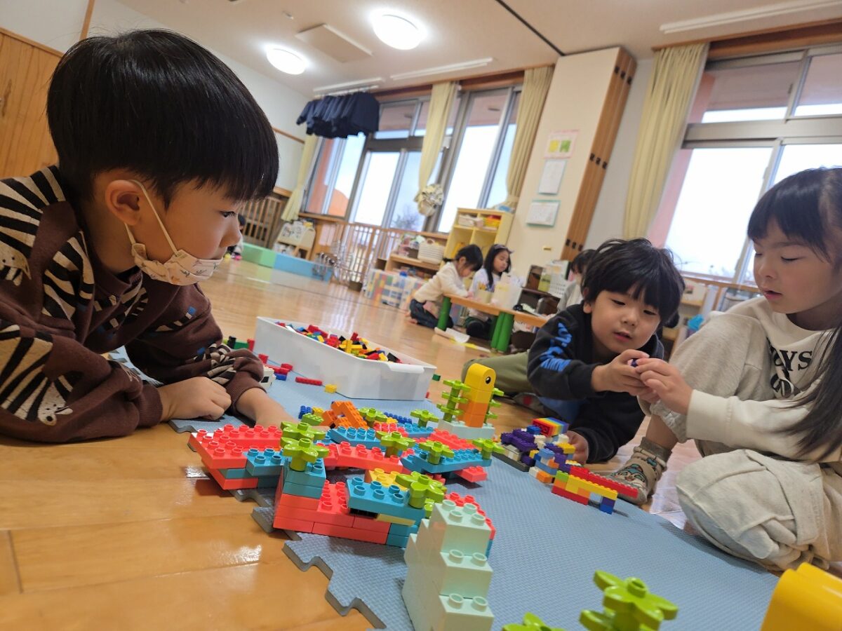 様々なブロックを使いながら色々なものをイメージして遊んでいます。「これは海の生き物」「ここはお家ごっこ♪」など、お友達と一緒にイメージを広げながら楽しんでいます。