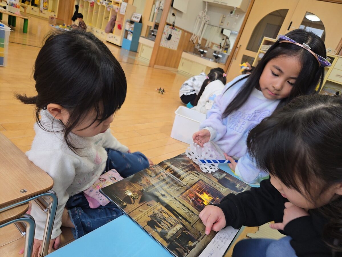 「みっけ!」の絵本に夢中なお友達♪「これは何?」「どこにあるの~?」「あ!これもあった!」と絵本の世界に魅了されながら、お友達と教え合い楽しんでいます☆