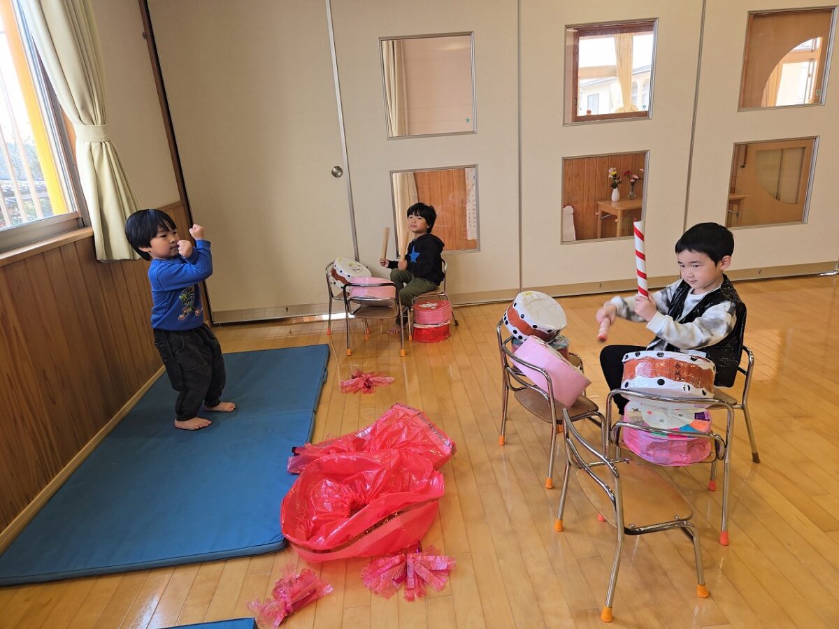 ダンスを踊るお友達と一緒に、太鼓を叩いてリズムにのるお友達♪顔の表情からもそれぞれがなりきっている様子が伺えますね💕