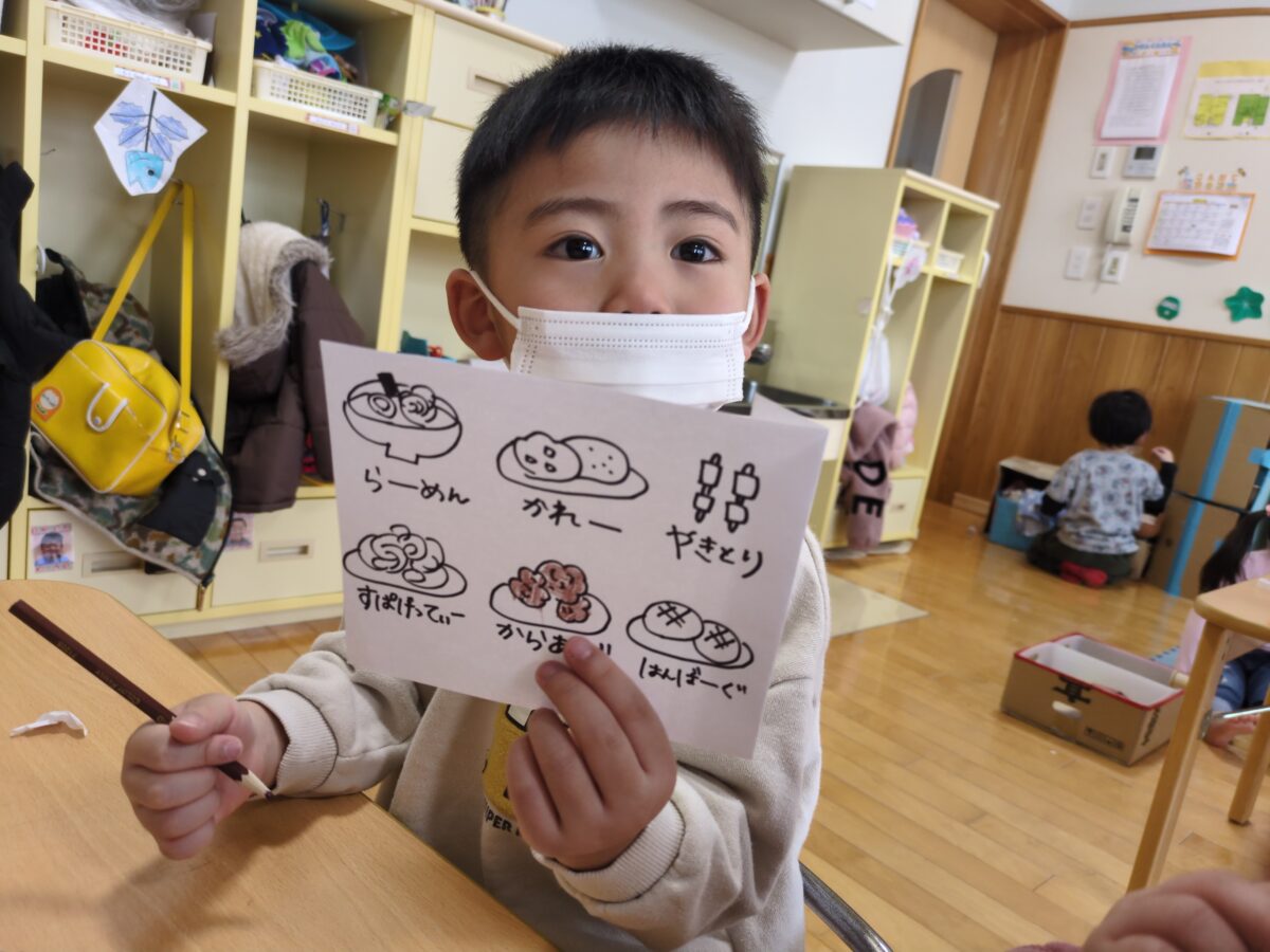 「メニューは何にしますか?」と、お店屋さんごっこで細かいやりとりが増えてきたので、みんなでメニュー表を作りました🍜おままごとの素材から、何のメニューが作れるか話し合って、大人気のラインナップが揃ったメニューになりましたよ!