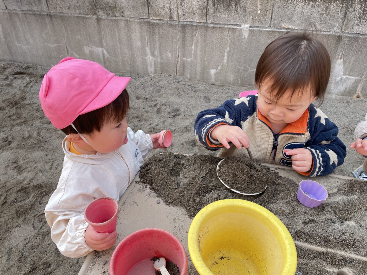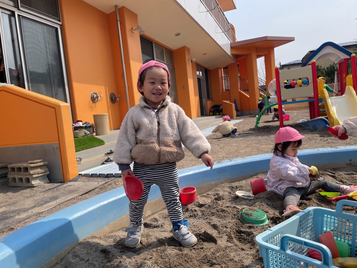 砂遊びで誕生会を再現し、ケーキを作っていたお友達、「せんせいみて!ケーキだよ」と教えてくれたり、砂場に穴を掘って「せんせいみて!」と嬉しそうに教えてくれるこどもたちでした!