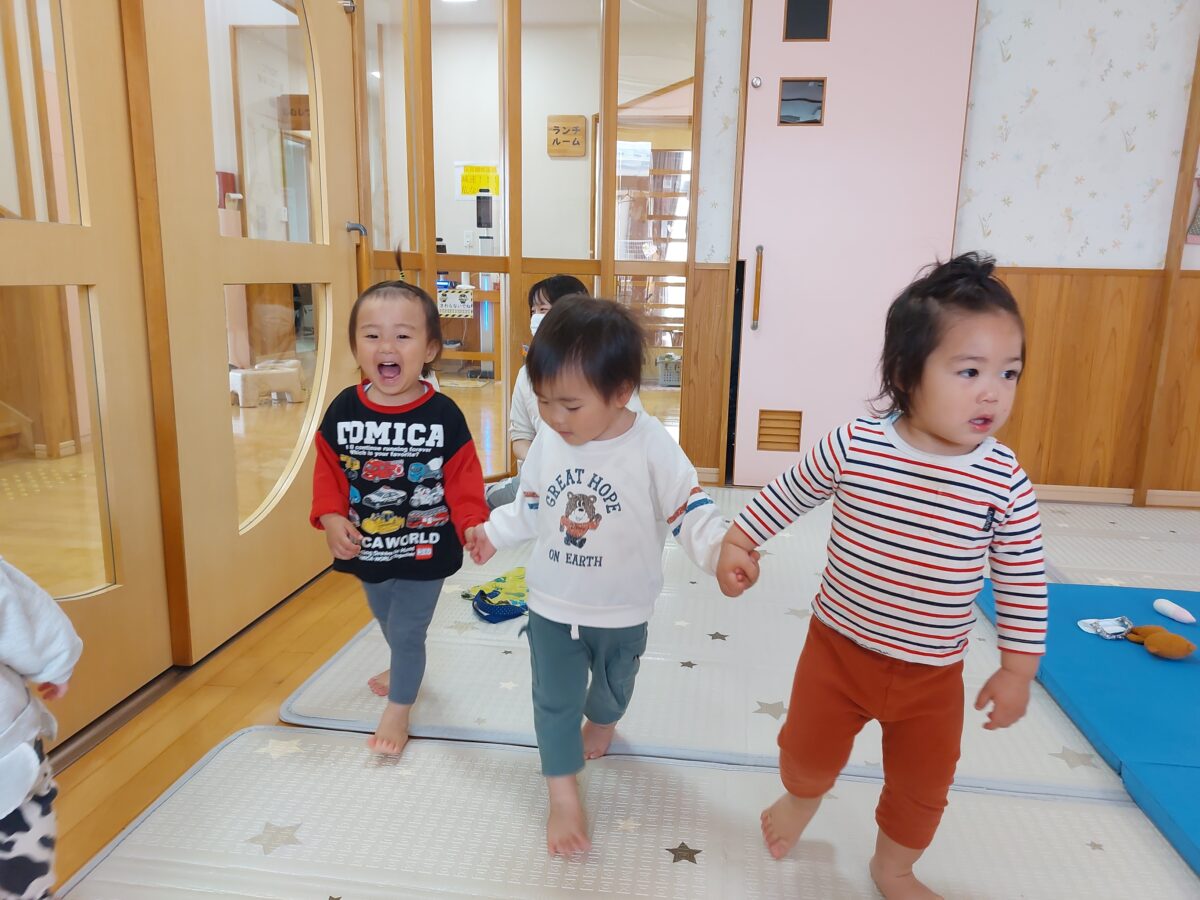 最近の好きな遊びがもう一つあり、さんぽの音楽に合わせて友達と手を繋ぎながらお部屋のお散歩を楽しんでいます♡