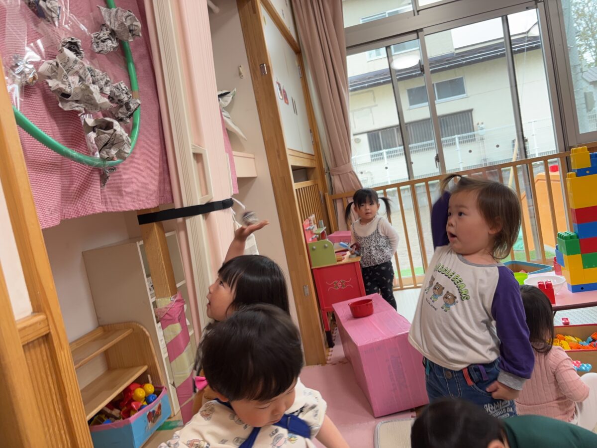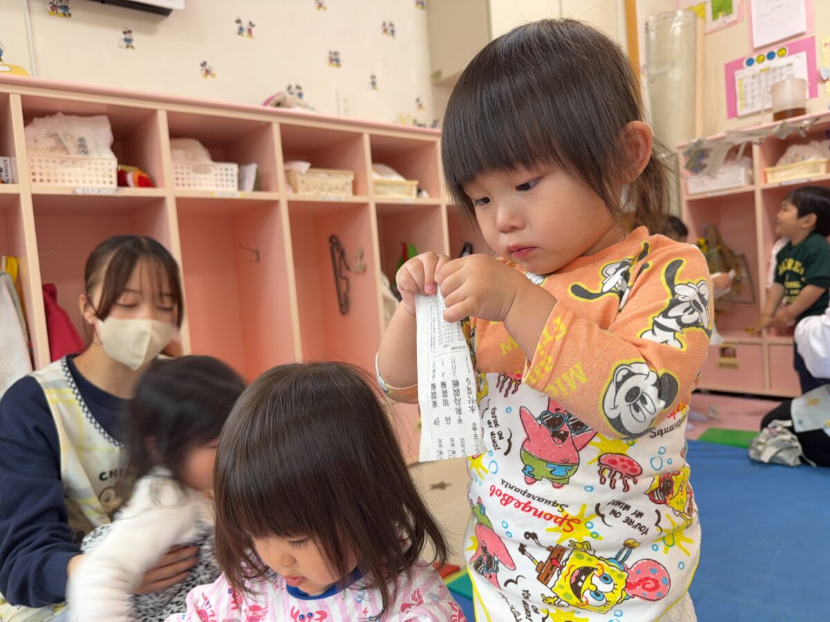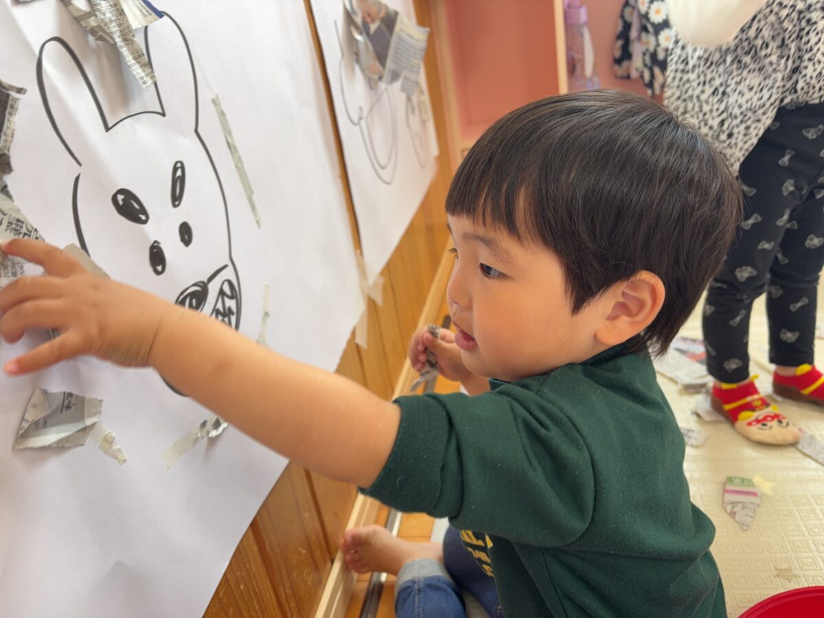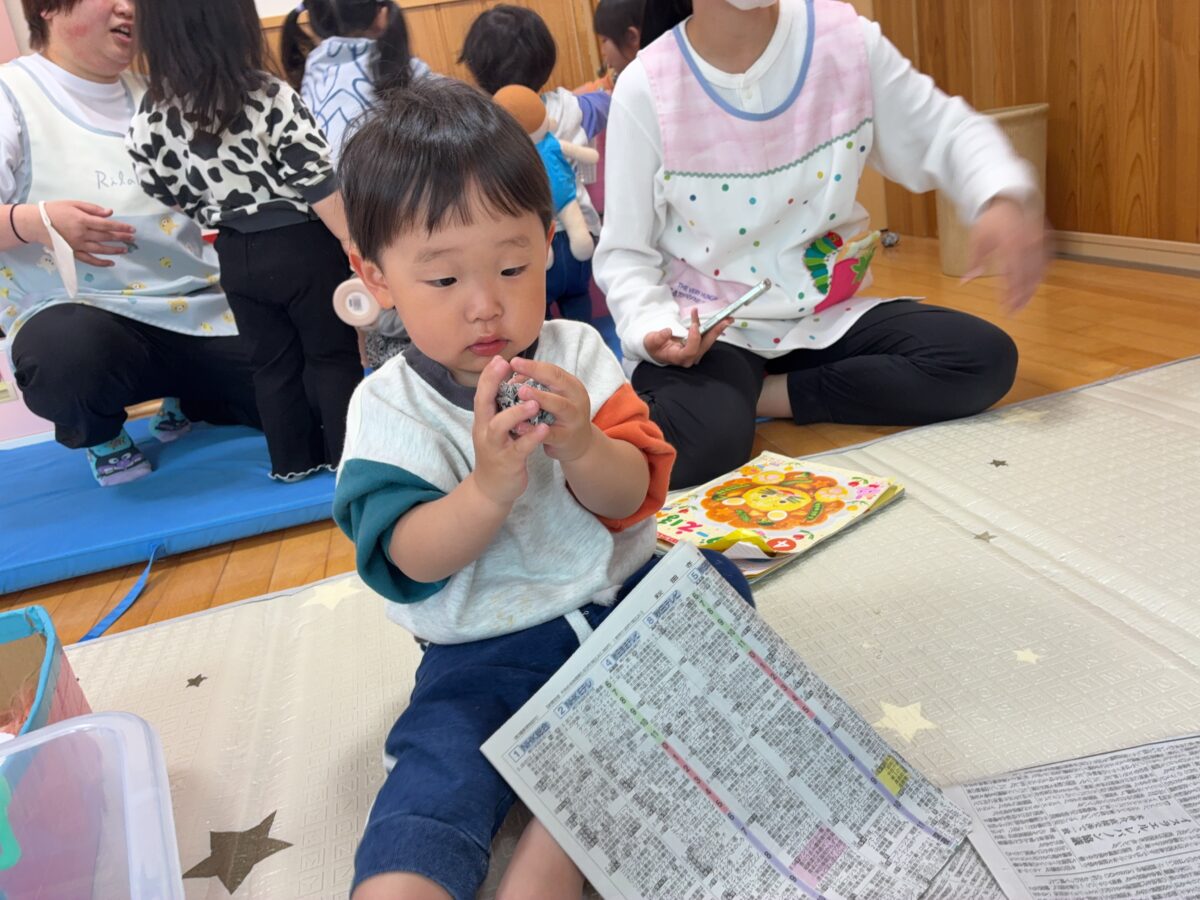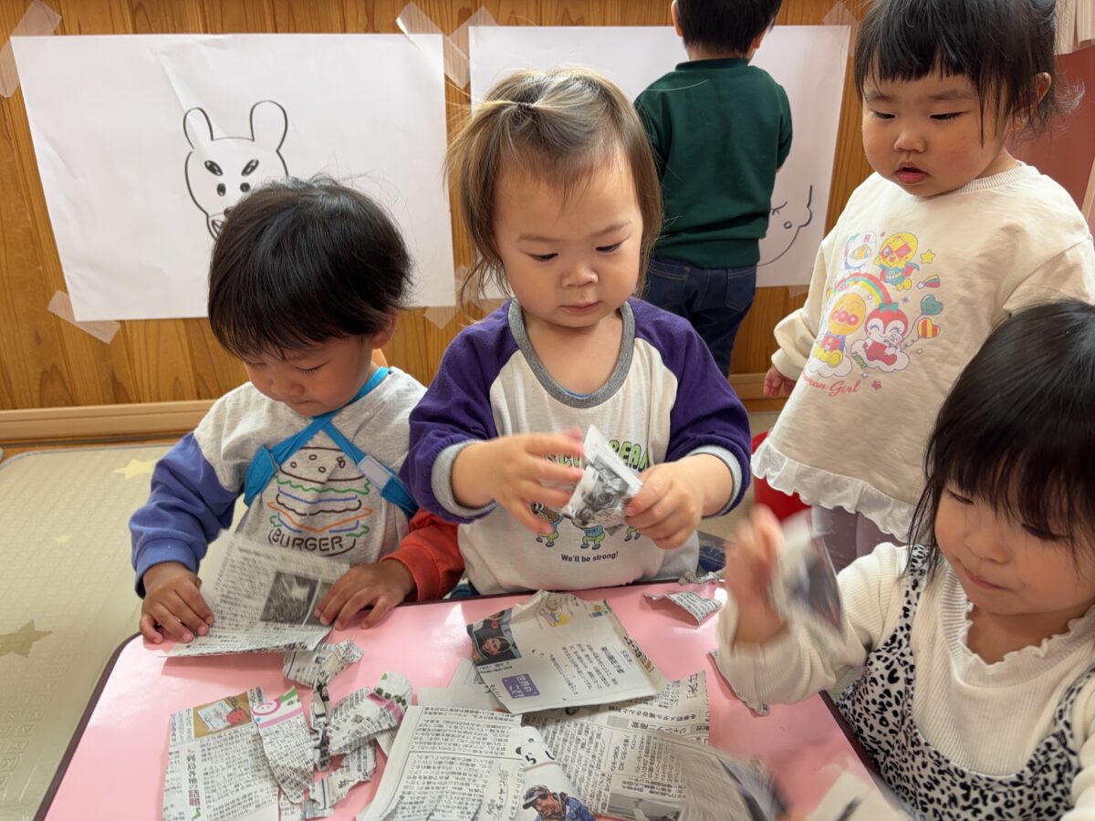 ちぎった新聞紙を紙にペタっと貼って動物を作ったり、丸めたボールを野球選手のように「えい!」と投げて遊んでいましたよ😆💕