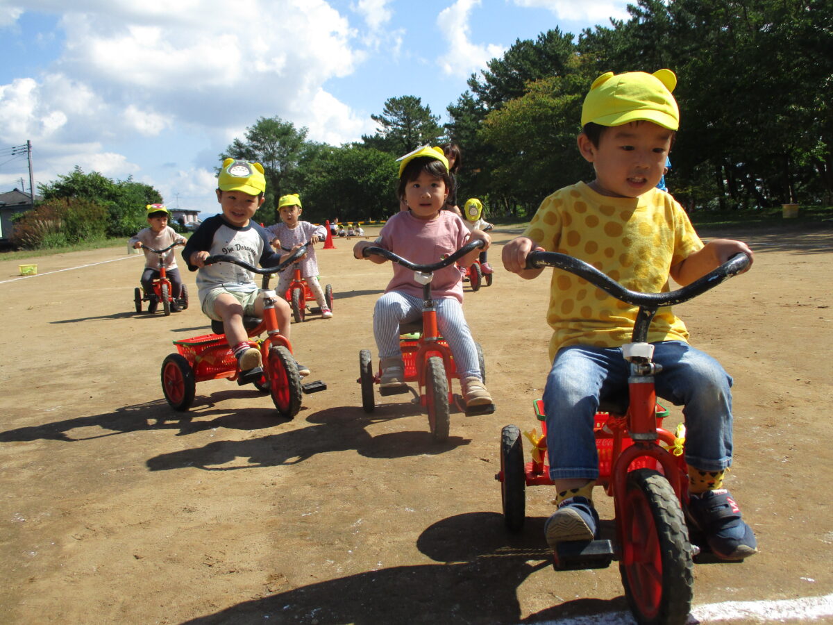 お兄さんお姉さんが応援する中、トトロに変身してかけっこや三輪車を楽しみました☆転んでも泣かずに、最後まで一生懸命頑張りましたよ。