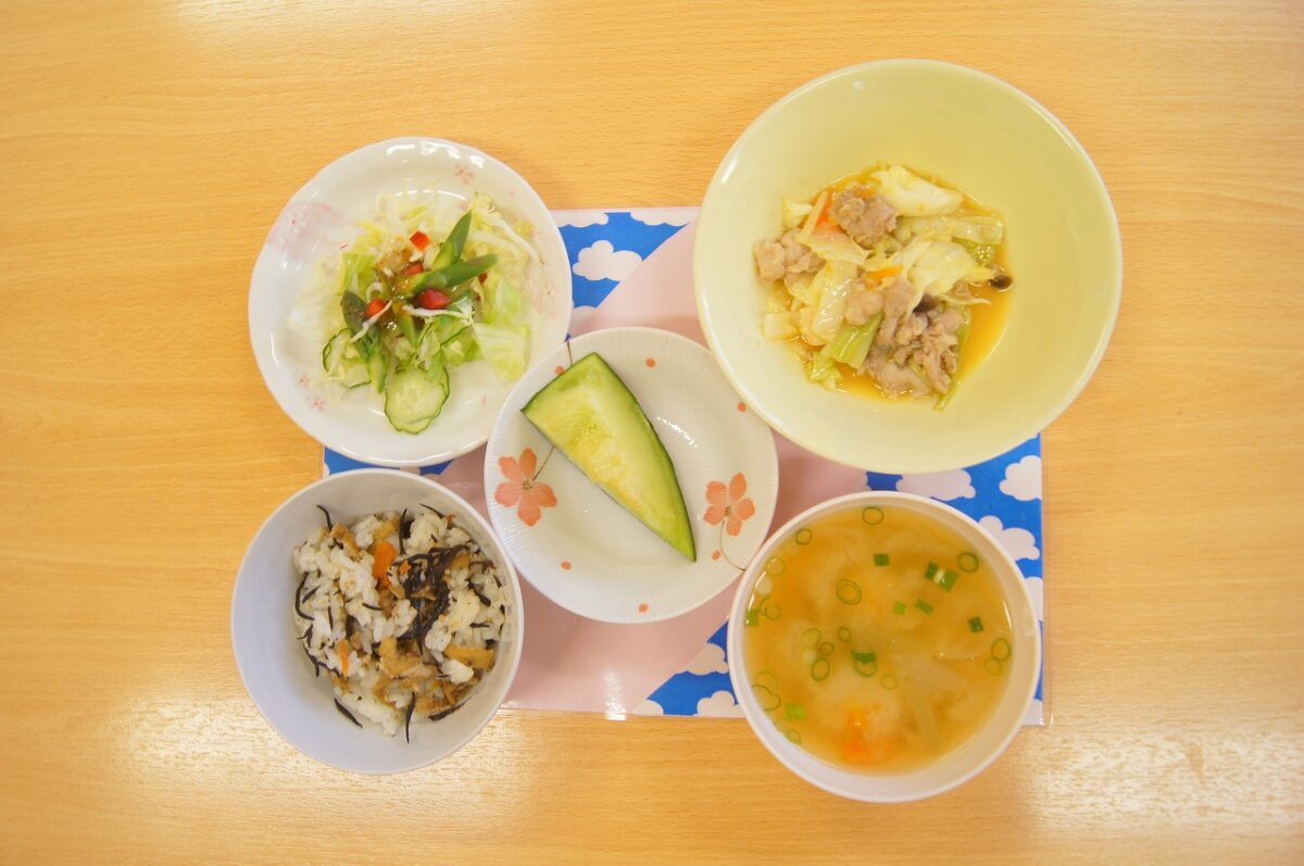 たか組さんはパンやナゲットをバイキング形式で、上手にお皿に盛っていました。5月16日今回は春野菜の肉じゃがに、春キャベツを入れました。意外ですが、しんなりトロトロになって合います。