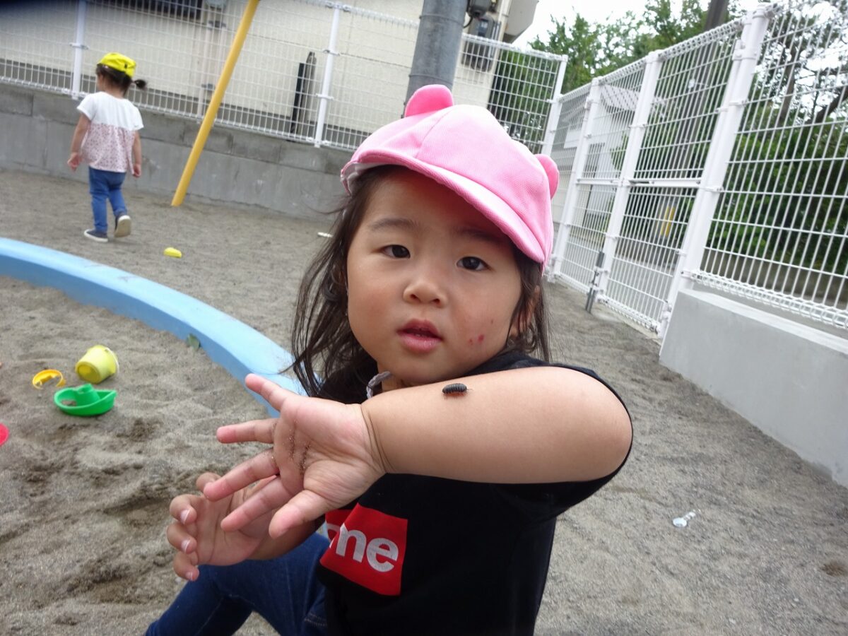 「先生!」と必死に呼ぶ声が聞こえて「どうしたの?」と聞くと、「登ってきた!とってー!」と、ダンゴムシを手に乗せていたら、腕に登ってきてびっくりしたようです♪