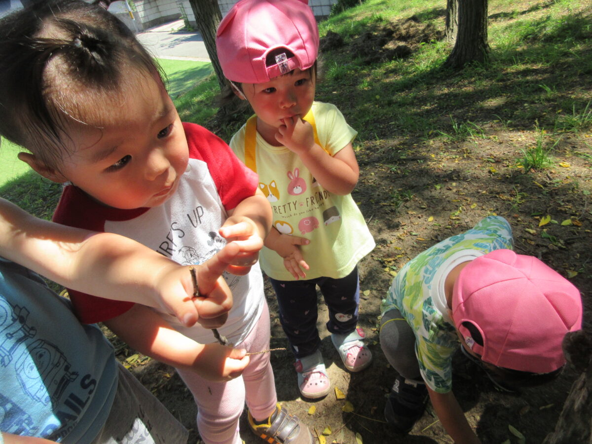 林の広場に行き、木の幹にくっついている虫の抜け殻を発見!!「これ、なんだ?」と怖がりながらも近づいて観察したり触ろうと手を伸ばしたり興味津々!!自然の中で色んな発見をしながら吸収し、成長していくのが楽しいですね★