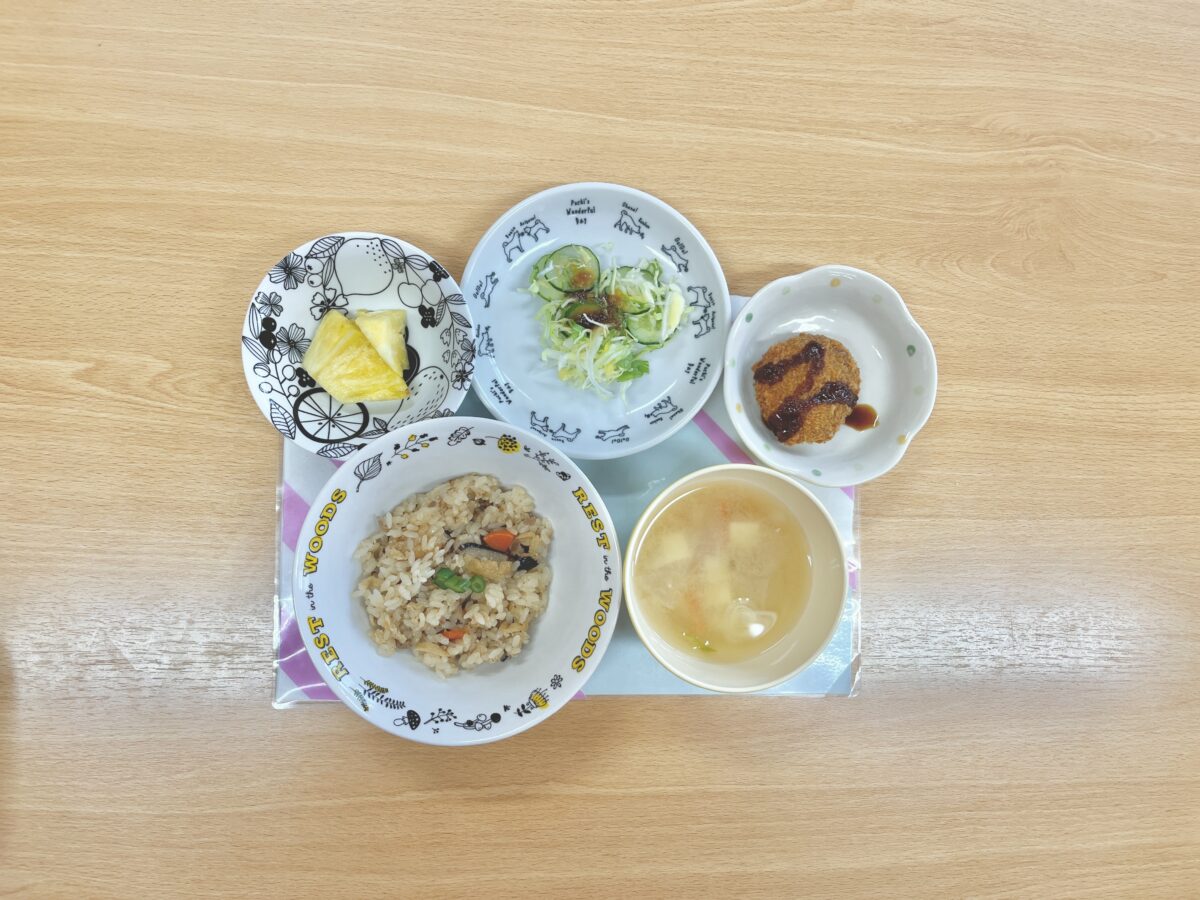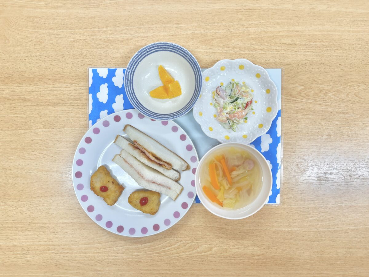 11月25日今日は混ぜご飯でした♪牛肉と舞茸、椎茸の香りが良く出ており、子ども達にもよく食べられていました☆水菜のサラダはさっぱりとしており、シャキシャキとした食感を楽しめます💕11月21日今日はすき焼き風牛丼でした☆お肉と野菜のうまみたっぷり、すき焼き風の甘じょっぱい味付けでご飯が進みます♪11月20日今日は、アジの漬け揚げです♪サクサクに揚がった漬け揚げはご飯との相性抜群です☆牛肉のチャプチェは、ごま油が効いた一品です。11月19日今日は、ハムピカタサンドでした☆ソースがしみ込んだハムピカタは食パンによく合います♪コールスローサラダは、キャベツやきゅうりの食感を楽しみながら食べる事が出来ました。11月18日寒い日にぴったりの五目うどんでした☆豚肉とネギの旨味が良く出た出汁です♪かき揚げは、プリプリの海老がたっぷりと入っておりうどんとの相性も良いです。11月17日今日はチキンカツでした♬お好み焼き風に、ソースと鰹節をまぶして食べるととっても美味しいです☆子ども達にも大人気でした♡11月14日今日は、人気メニューのハンバーグでした☆フワフワのハンバーグにデミグラスソースが良く合います♫切干大根煮は、軟らかく煮込まれており優しい味わいです。11月13日今日は、照りマヨサンドでした☆甘じょっぱい照り焼きチキンと、マヨネーズが良く合います♫具だくさんなチャウダーは、体の温まる一品です。11月12日今日は柔らかいお肉が美味しいチャーシュー丼です♪じっくり煮込んでいるのでお肉が柔らかく、子ども達にも大人気でした☆サラダは春雨を使ったさっぱりとした仕上がりです😊11月11日今日は、鮭のコーンマヨ焼きでした☆コーンの甘みが璃食べやすい一品です。新メニュージャーマンポテトは、ベーコンの塩気がじゃがいもや玉ねぎによく合います♫11月10日今日は肉じゃがとひじきごはんでした☆肉じゃがのじゃがいもはホクホクとしており、子ども達にもよく食べられていました♡フルーツは今季初の甘くて美味しい柿でした♬11月7日今日は、肉丼でした。玉ねぎの甘みが良く出ており人気のメニューです♬ちくわの磯辺揚げは、磯の香りを楽しむことができます☆11月6日今日は鯖のカレー醤油焼きでした☆カレー風味の鯖はご飯が進む味付けで、子ども達にも大人気でした♬筑前煮は里芋がたっぷりと入っており、柔らかく優しい味わいです♡11月5日今日は、ウインナーサンドでした。ケチャップソースが良く絡んでおりとても人気のあるメニューです☆ワンタンスープは、様々な具材が入っており体の温まる一品です♡11月4日今日は、長ネギつくねでした♬旬の長ネギとたっぷりと混ぜ込みました♡すき昆布煮は、やわらかく煮込まれておりとても人気のあるメニューでした。10月31日今日は、ハロウィンがテーマのランチでした☆旨味たっぷりハッシュドビーフにかわいいおばけのごはんを乗せました👻かぼちゃのサラダは、ツナを使用してコクのある仕上がりになりました♡10月30日今日は大人気メニューのミートソーススパゲティでした💕子ども達は大喜びでたくさん食べてくれました♬スープに使っているキャベツは柔らかく甘みがあり、食べやすいです☆10月29日今日は、ボリューム満点牛丼でした☆新メニューのカブの和風サラダは、旬であるカブをたっぷりと使用しています♬10月28日今日は、ふんわりと焼きあがったムキカレイの塩麴焼きです☆優しい味わいでごはんが進みます♬蓮根のマヨ炒めは、蓮根の食感がクセになる一品です♡10月27日今日はわかめごはんと豚汁でした♬寒い時期にぴったりのメニューで、子ども達にもたくさん食べてもらえました♡サラダにはしらすが乗っており、カルシウムをたっぷり美味しく摂れます☆10月24日今日はきのこたっぷりのハンバーグでした🍄食物繊維豊富で、秋を感じさせるメニューとなりました☆10月23日今日は、ツナサンドでした☆マヨネーズのまろやかさがロールパンによく合います♬カレースープは、具材がたっぷりと入っており満足感のある一品です。10月22日今日は豚肉とごぼうの混ぜご飯でした☆みそ汁には里芋をたっぷり使っており、秋を感じさせるメニューとなりました🍂10月21日今日は、鮭の照り焼きでした。甘じょっぱい照り焼きは新米あきたこまちにぴったりです♬ポテトサラダは、カリカリベーコンが良いアクセントになっています♡10月20日今日は大人気メニュー、鶏のから揚げでした♬お肉は柔らかくジューシーで、ごはんが進む味付けになっています♡ひじき煮はカルシウムたっぷりで、こどもの成長を支えてくれます★10月17日今日は、卵サンドでした☆クリームチーズを混ぜることでなめらかでコクのある仕上がりになっています♬ワンタンスープは、野菜のうま味たっぷりで人気メニューでした。10月16日今日はドライカレー風ピラフでした🌟カレー風味のピラフで、野菜もたっぷり摂れます♬スープには旬の白菜を使い、甘みがあり柔らかく美